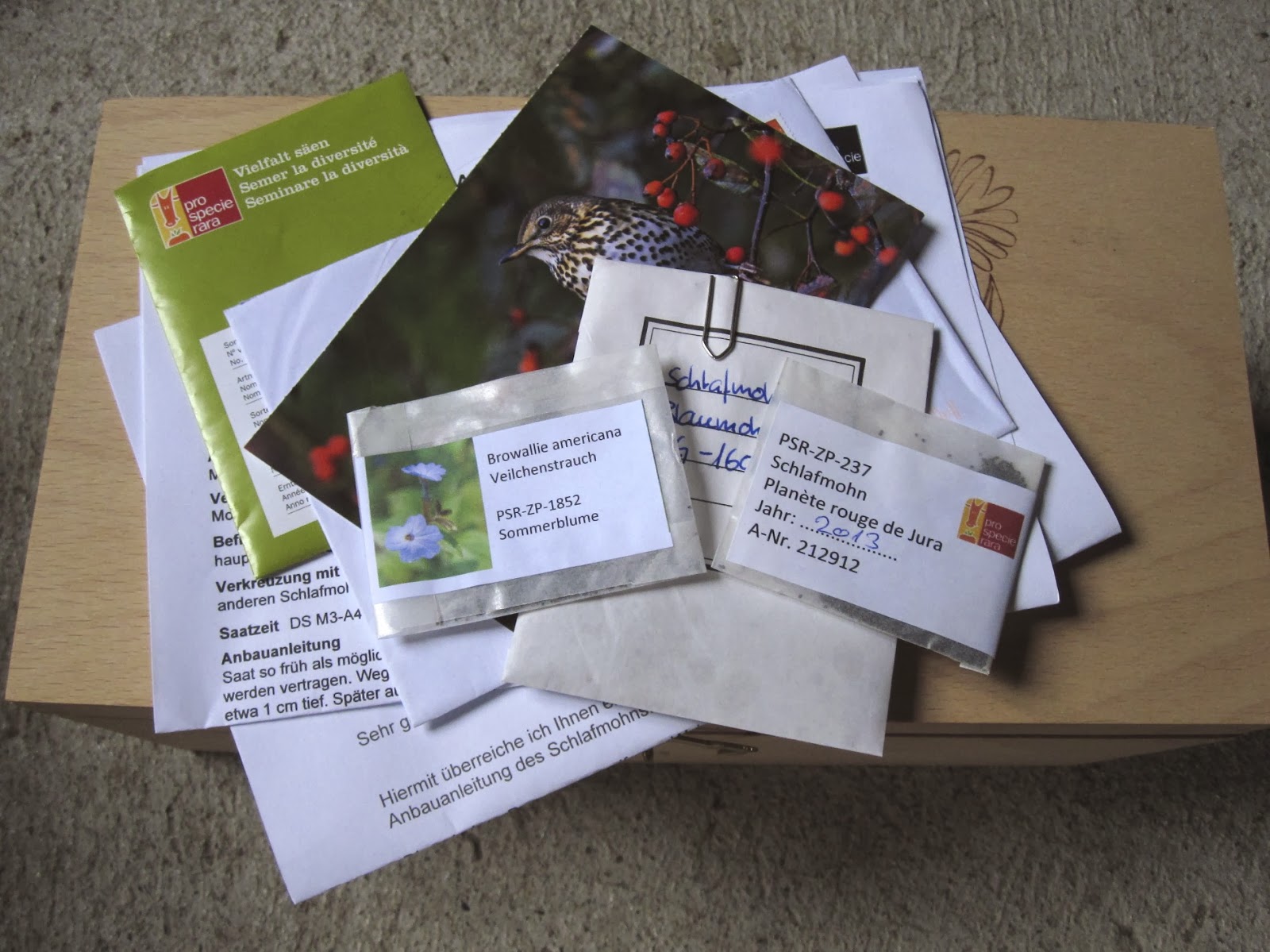 Über die letzten Wochen traf bei mir immer mal wieder ein Brief mit Saatgut ein. Als ProSpecieRara Gönnerin darf ich von diversen Gemüse-, Kräuter- und Blumensorten gratis Saatgut beziehen. Das Saatgut stammt von Privatpersonen, welche dieses für ProSpecieRara und nach deren Richtlinien anbauen und im Sortenkatalog anbieten. Ich freue mich ganz besonders über dieses Saatgut, da es von anderen passionierten Gärtnerinnen und Gärtnern stammt und oft von einer persönlichen Karte, einer Anbauanleitung oder auch mal von einem Briefchen extra Saatgut begleitet wird.